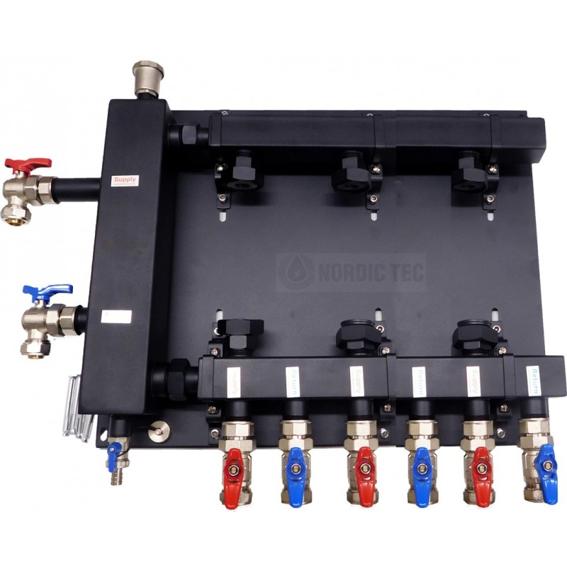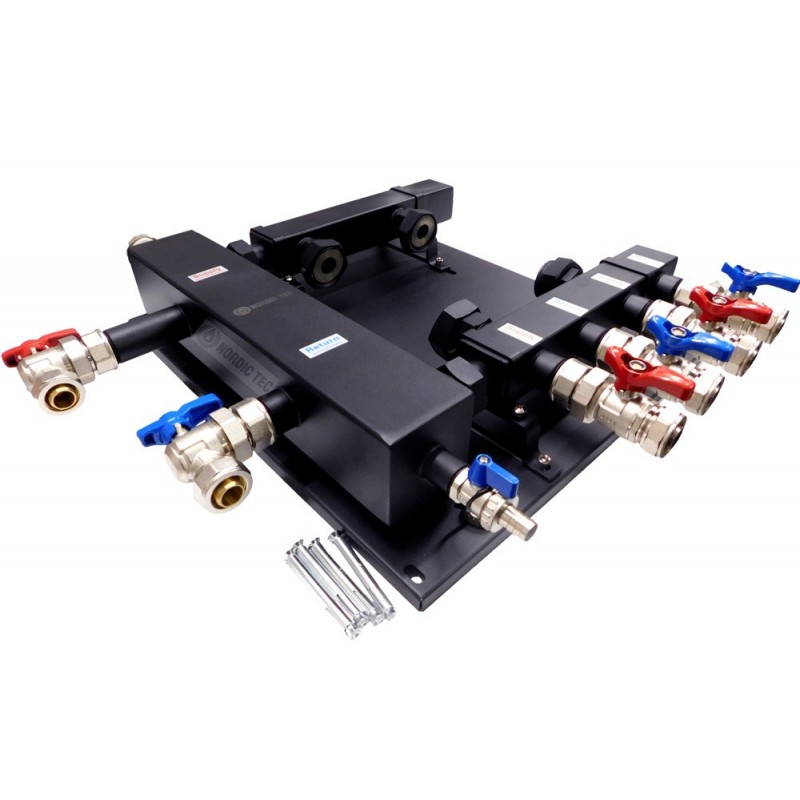Nordic Tec hydraulický separátor / vyrovnávač s rozvodem okruhu pro centrální vytápění - pro 3 topenářské sekce na montážní desce na zeď