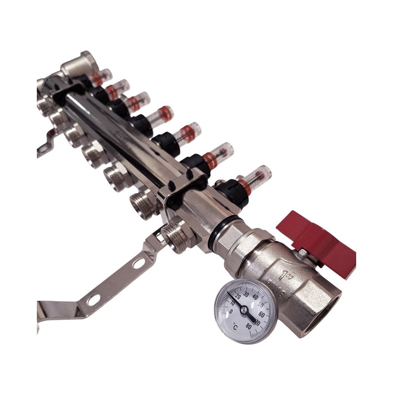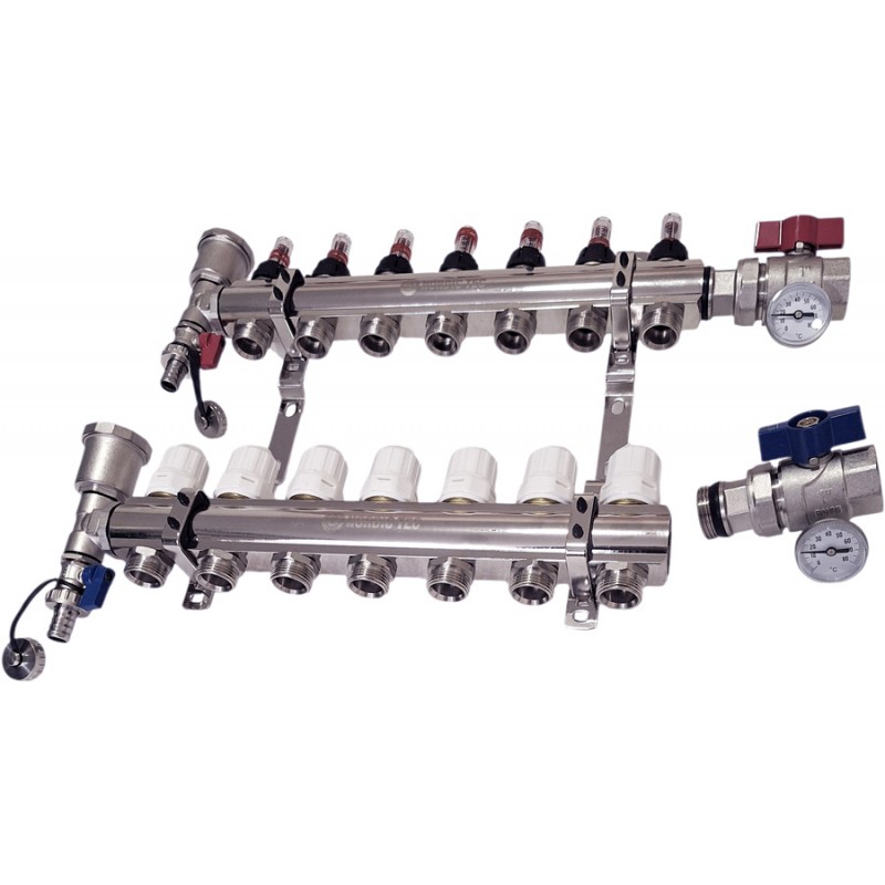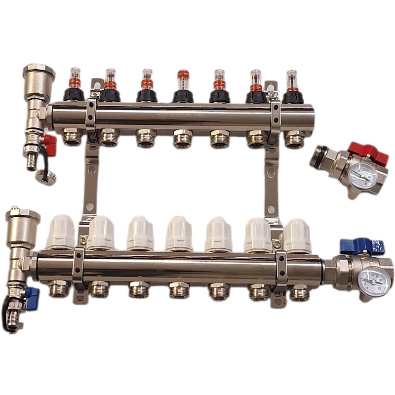 Kompletní rozdělovač pro podlahové vytápění s 7 okruhy, plně vybavený všemi potřebnými díly a příslušenstvím, který umožňuje připojení 7 sekcí ústředního vytápění. Všechno v jedné sadě, bez potřeby hledat nebo kupovat další součásti zvlášť. To znamená úsporu času a peněz: rozdělovač s 7 okruhy je již sestavený, co se týče průtokoměrů a ventilů. Stačí jen rozhodnout, na které straně nainstalovat kulové ventily a teploměry pro podlahové vytápění a na které straně umístit odvzdušňovací ventily, a následně je přišroubovat. Sestavení celé sady trvá jen několik minut.