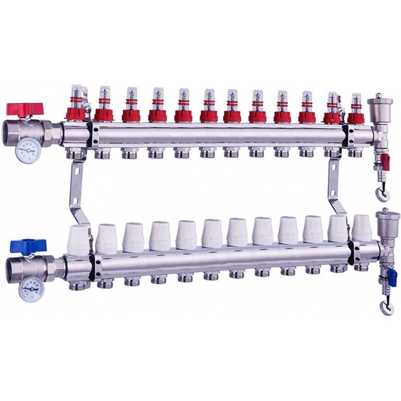 Rozdělovač pro podlahové topení s 12 výstupy – klasický rozdělovač plně vybavený, včetně ventilů s měřením teploty vstupu/výstupu.