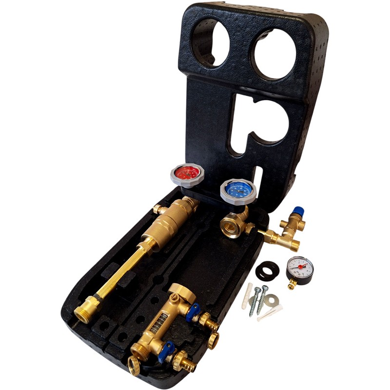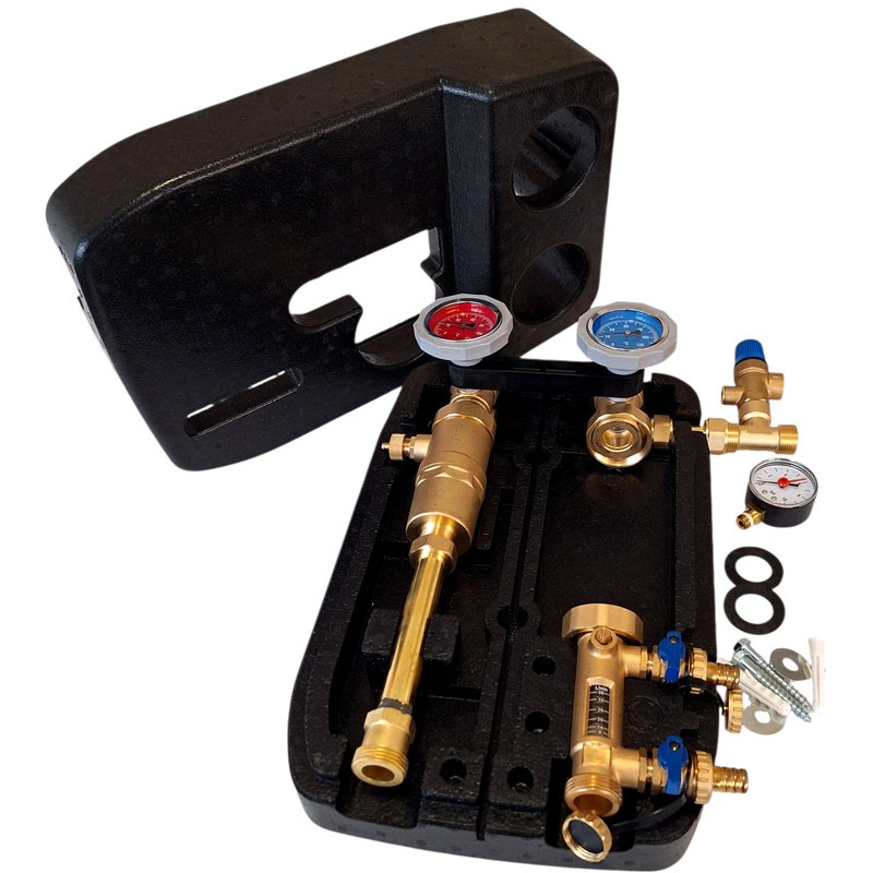 - obvykle se skládá ze dvou uzavíracích ventilů, místa pro oběhové čerpadlo, rotametru, pojistného ventilu, manometru a odlučovače vzduchu