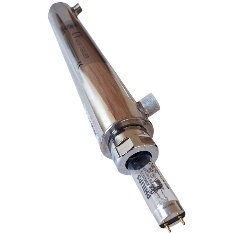 Sterilizátor UV pro pitnou a užitkovou vodu - Nordic Tec - primárně proti bakteriálním a virovým infekcím. Zařízení - UV lampa na čištění vody - o výkonu 25 W založené na UV-C žárovce vysílající ultrafialové záření. UV Lampa na pitnou vodu 6 GPM při správném výběru zajišťuje více než 99% účinnost proti bakteriálním infekcím jako je -E.coli a streptokoky.